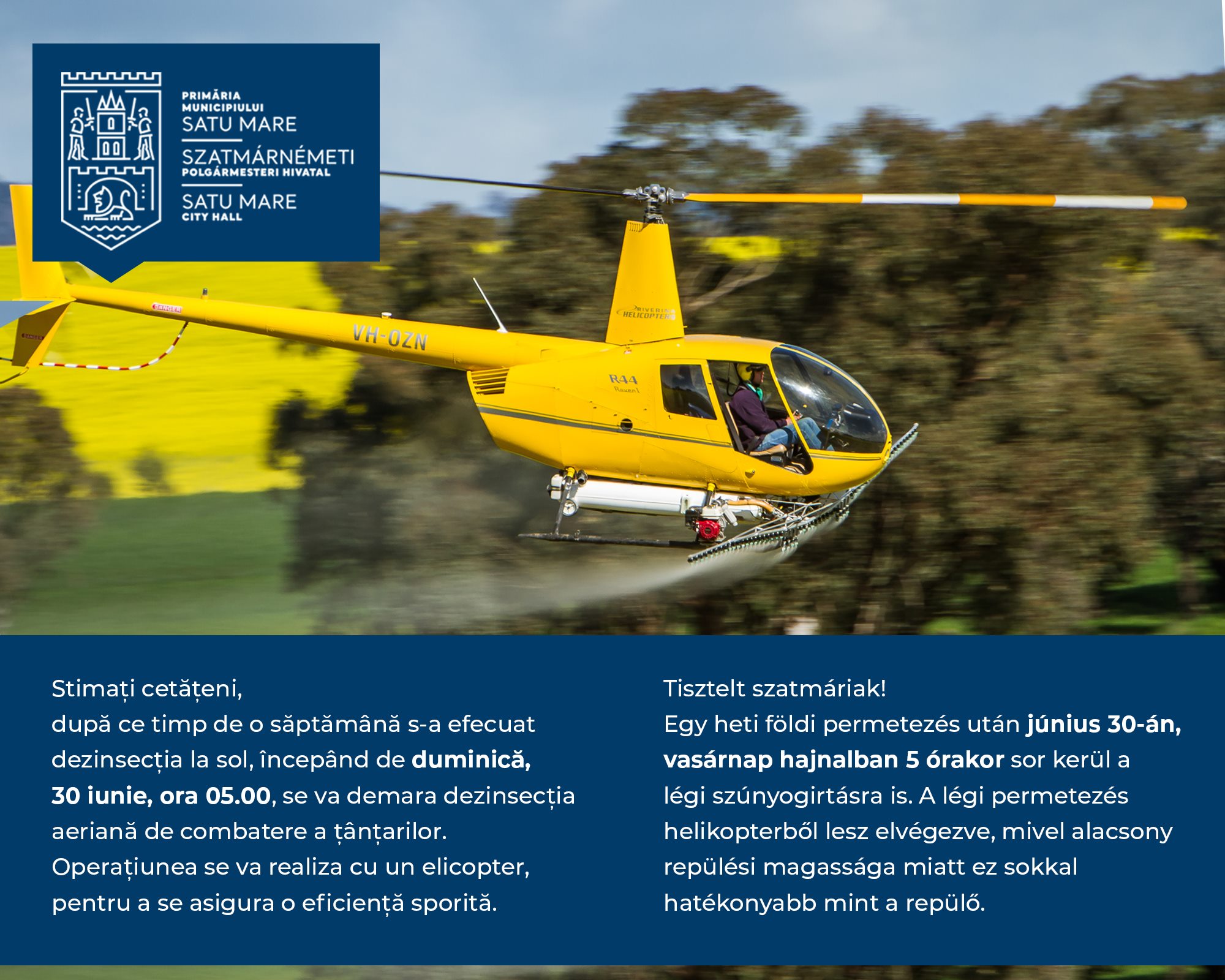 ”Stimați cetățeni, după ce timp de o săptămână s-a efecuat dezinsecția la sol, începând de duminică, 30 iunie, ora 05.00, se va demara dezinsecția aeriană de combatere a țânțarilor. Operațiunea se va realiza cu un elicopter, pentru a se asigura o eficiență sporită”, susțin reprezentanții Primăriei Satu Mare.