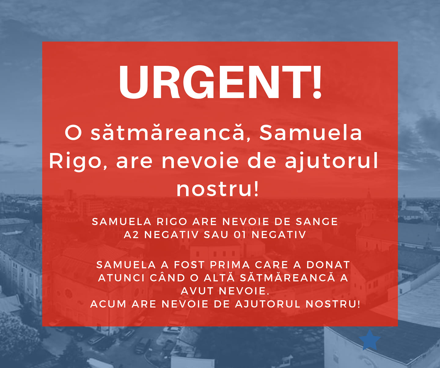 ”Samuela Rigo are nevoie URGENTĂ de ajutorul nostru! Ea este o mămică foarte ajutătoare, data trecută când am postat un asemenea anunț pentru o doamnă a fost prima care a sărit în ajutor și acum are nevoie de noi! Cei care pot dona vă rugăm să specificați la centrele de transfuzie că este pentru RIGO Samuela, internată la Spitalul Municipal Baia Mare, secția terapie intensivă”, este apelul apropiaților.