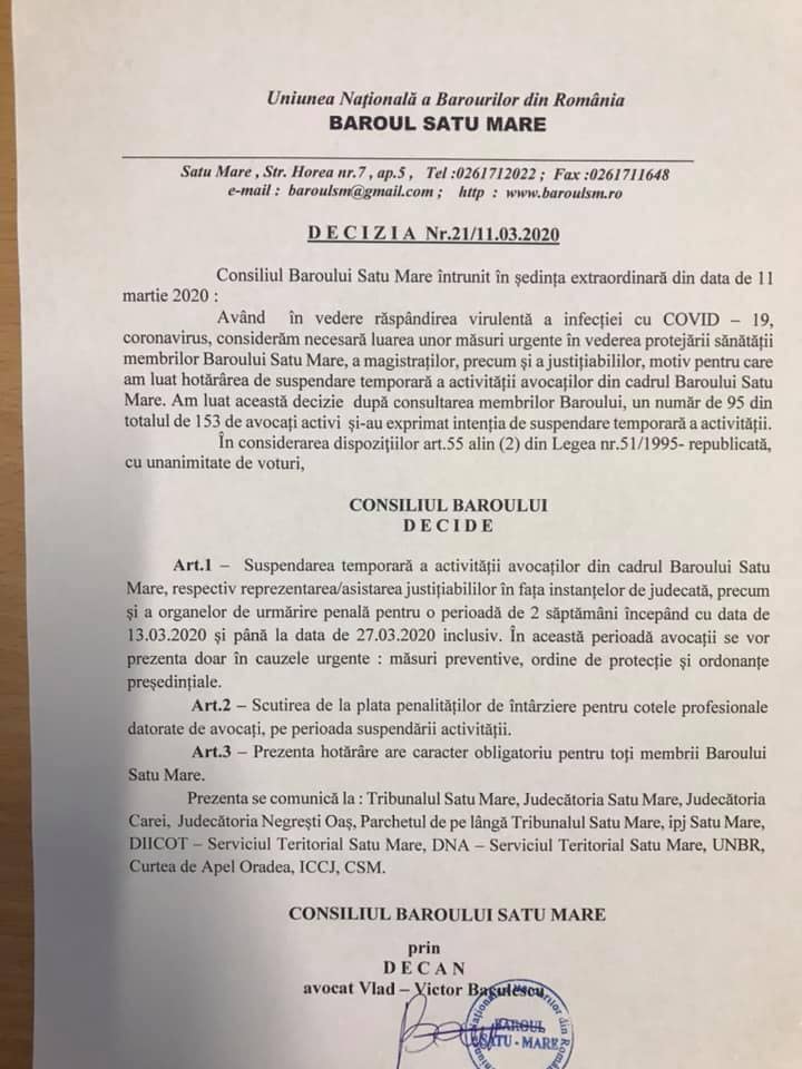 ”Suspendarea temporară a activităţii avocaţilor din cadrul Baroului Satu Mare, respectiv reprezentarea/asistarea justiţiabililor în faţa instantelor de judecată, precum şi a organelor de urmărire penală pentru o perioadă de 2 săptămâni începând cu data de 13.03.2020 şi până la data de 27.03.2020 inclusiv, în această perioadă avocaţii se vor prezenta doar în cauzele urgente măsuri preventive, ordine de protecţie şi ordonanţe preşedinţiale”, este una dintre prevederile adoptate de Baroul Avocaților.