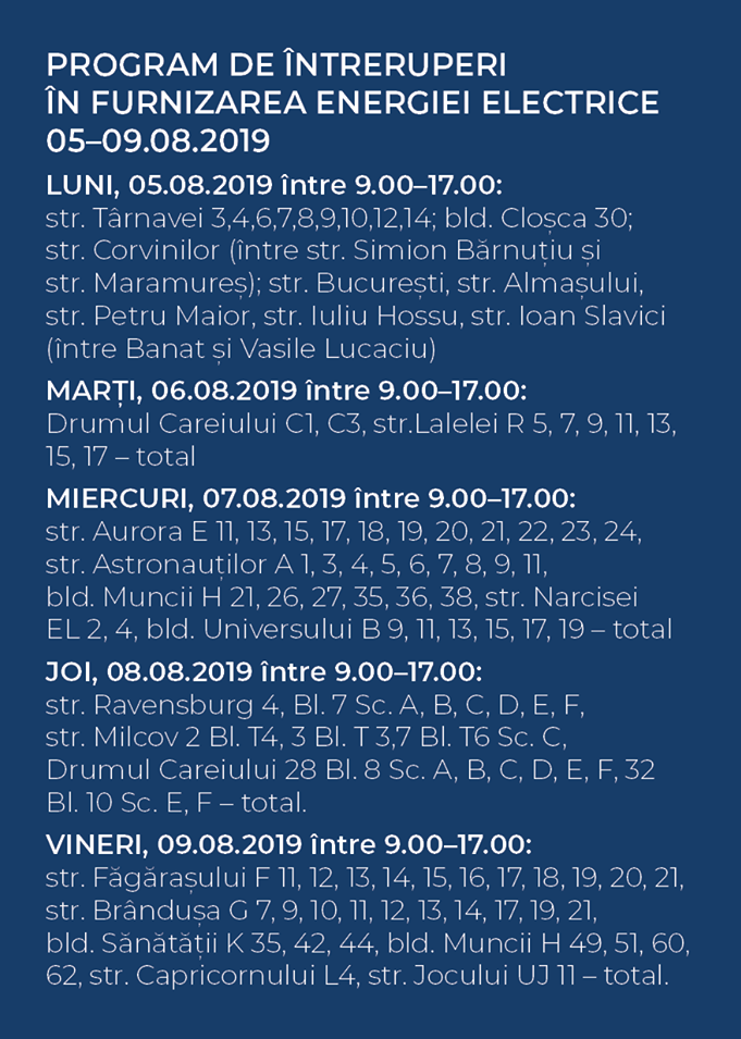 Societatea de distribuție a energiei electrice anunță întreruperi programate în alimentarea cu energie electrică, în municipiul Satu Mare, după cum urmează: