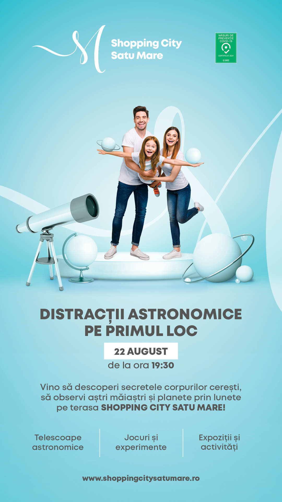Pe 22 august, de la ora 19.30, Shopping City Satu Mare te invită la Distracții astronomice pe primul loc, evenimentul inedit al verii: o călătorie prin Univers și cu opriri pe Lună, Saturn și Jupiter. Alături de Cătălin Beldea, vânător de eclipse și editor de astronomie al revistei Știință și Tehnică, vei putea descoperi mai multe despre Univers. Vei afla cum s-a format Sistemul Solar, cum a apărut Universul și viața pe Terra și, poate, răspunsul la cea mai importantă întrebare: dacă există viață în Univers în afara planetei Pământ. Accesul la eveniment este gratuit.