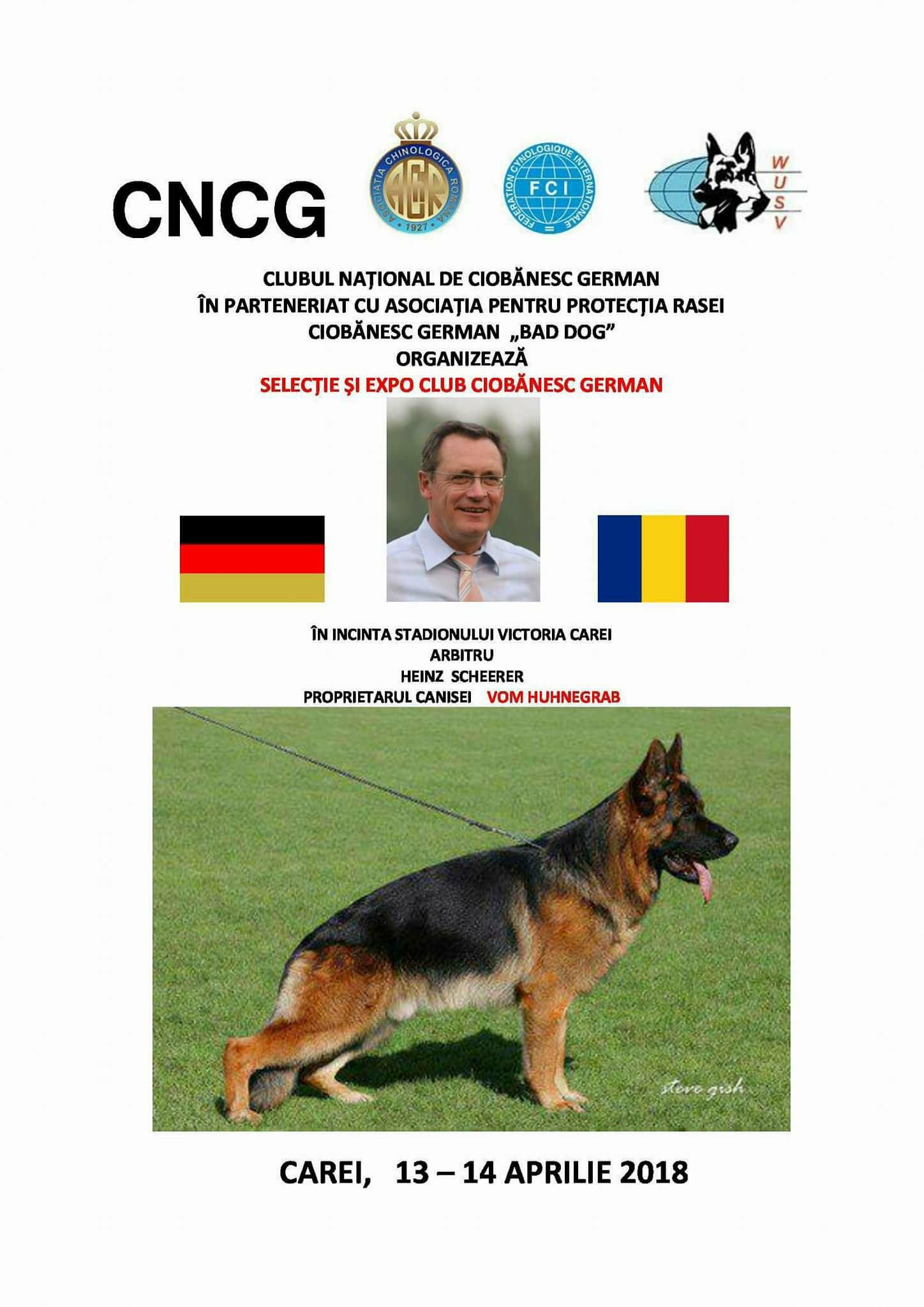 Clubul Național de Ciobănesc German, în parteneriat cu asociația pentru Protecția Rasei Ciobănesc German ”Bad Dog” organizează o expoziție de câini ciobănești germani. În cadrul expoziție se va face și o selecție, iar arboitru va fi Heinz Scheerer, proprietar al canisei Vom Huhnegrab.