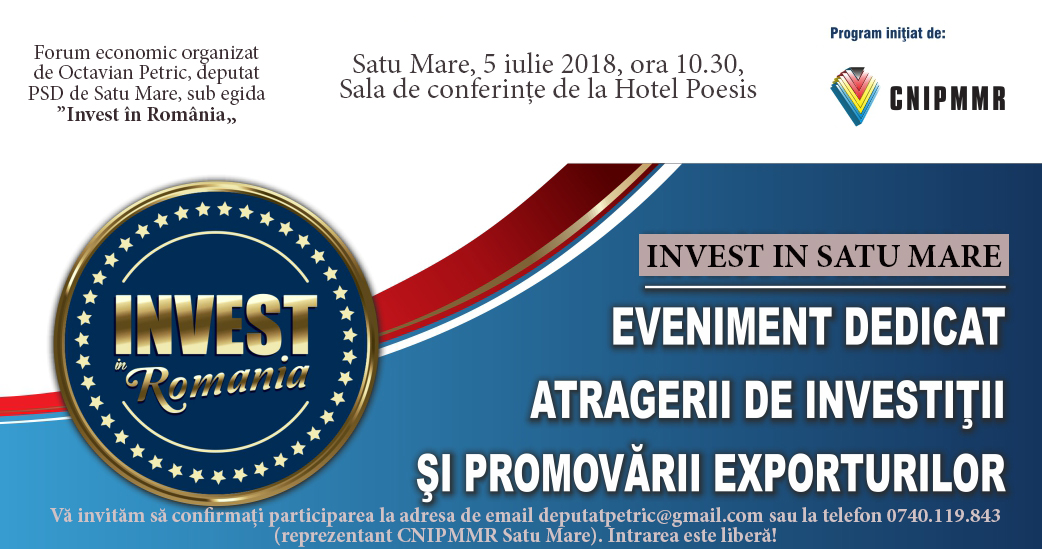 La inițiativa deputatului Octavian Petric, la Satu Mare va avea loc joi, 5 iulie 2018, a VIII-a ediție națională a Forumului Invest în România, care va pune la aceeași masă oameni de afaceri locali, importanţi actori ai mediului de afaceri şi patronate din România, autorităţi centrale, locale şi diplomaţi, cu scopul de a atrage investiţii la nivelul județului Satu Mare.