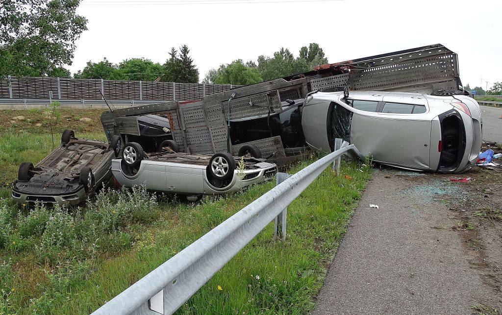 Autókat szállító kamion borult fel szerdán a magyarországi M5-ös autópályán Szeged határában. A Németországból Romániába tartó kamion eddig ismeretlen okból átszakította a külső szalagkorlátot és az oldalára borult, a szállított személyautók egy része is leborult.