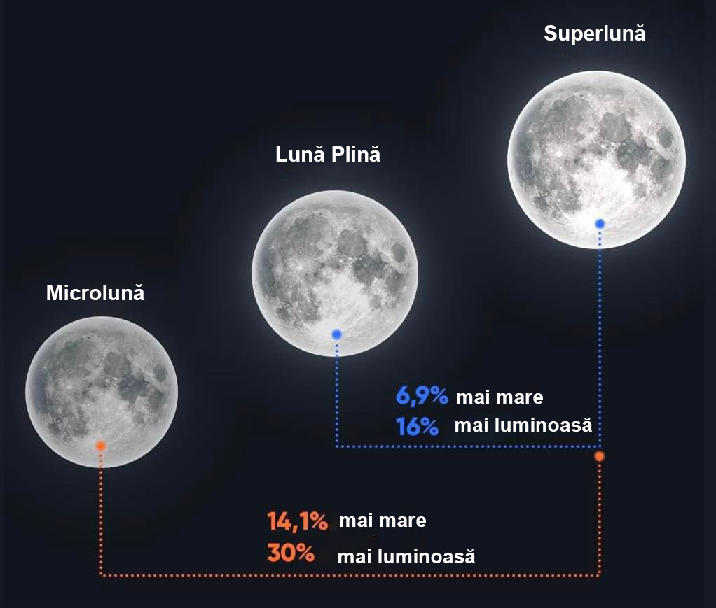"O astfel de Lună Plină apare cu 6.9% mai mare și cu 16% mai strălucitoare decât o Lună Plină obișnuită și cu 14.1% mai mare și cu 30% mai strălucitoare decât o Lună Plină la apogeu (distanța maximă Pământ-Lună).Astăzi, Luna trece la perigeu (357.263 km) la ora 12:09, iar Luna Plină se produce la ora 21:38", spun cei de la Astro Info.