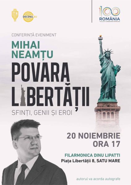 Mulțimea de analize subtile și întrebări pertinente — cine e suveranul în Uniunea Europeană? — face din «Povara libertății» un veritabil manual de teologie politică. Pledoaria pentru revoluția interioară prin redescoperirea păcii lui Iisus ne oferă un volum-unicat în limba română”, este prefața semnată de Constantin Necula. Filosoful Mihai Neamțu, conferință gratuită la Filarmonica ”Dinu Lipatti”. Își lansează noua carte