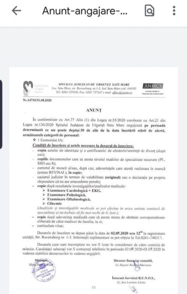 ”Eu doar scriu... De analizat, o vor face cei ce vor citi... Cum se scot posturi la concurs la Spitalul Județean Satu Mare! Post de Economist 1A, fără mențiunea serviciului, fără tematică, fără detalii de cum, când, unde se va organiza concursul... Post pus pe site în 31 (luni) cu termen de depunere în 2 (miercuri) la ora 12. Cu data (luna) corectată cu pixul! Oare când să-și scoată candidații cazierul sau adeverința sau când să-și facă analizele?