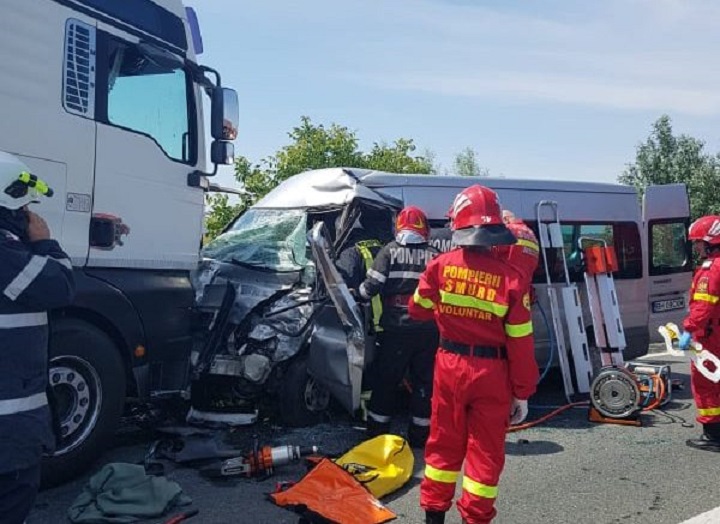 Impactul dintre autocamion și autoutilitară a fost unul frontal și deosebit de violent. Un alt autoturism, care circula din spatele dubei, nu a mai putut evita impactul.