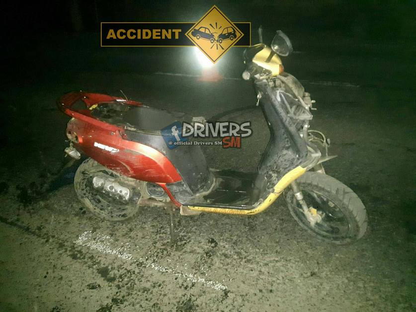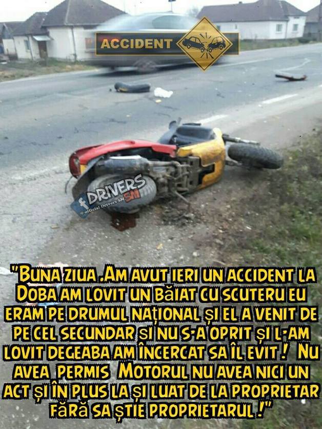 “Am avut ieri un accident la Doba. Am lovit un băiat cu scuteru. Eu eram pe drumul naţional şi el a venit de pe cel secundar şi nu s-a oprit şi l-am lovit. Degeaba am încercat să îl evit. Nu avea permis. Motorul nu avea niciun act şi în plus l-a şi luat de la proprietar fără să ştie proprietarul”, le-a povestit șoferul mașinii celor de la Drivers SM.