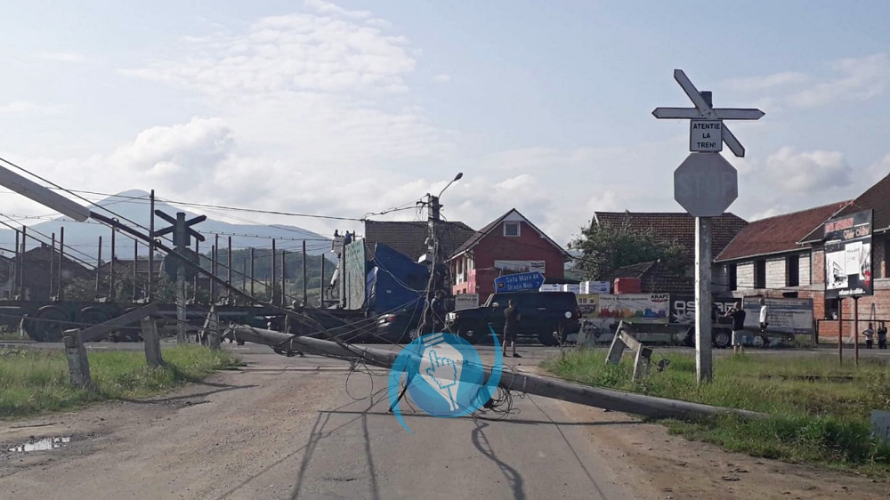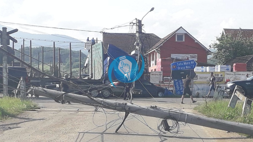 FOTO. Accident în județ. Localitate fără curent, stâlpi distruși de un TIR