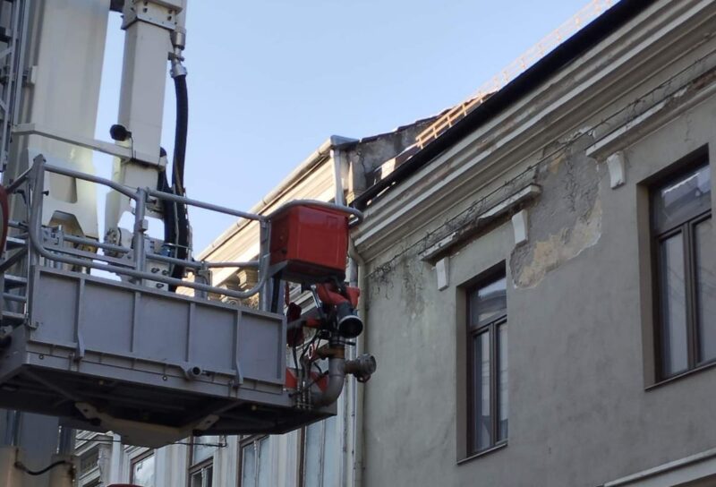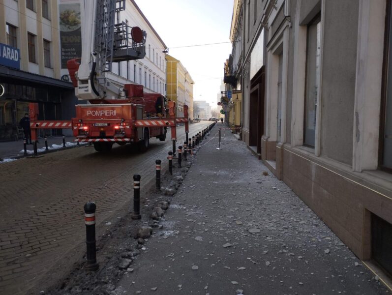 Intervenție a pompierilor pe strada Ștefan cel Mare după ce bucăți de tencuială au început să cadă de pe clădirea Bibliotecii Județene Satu Mare, recent achiziționată de Consiliul Județean Satu Mare.