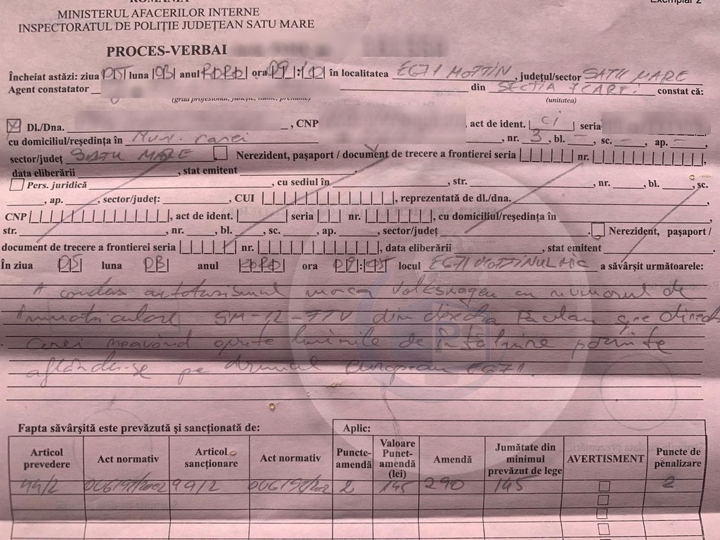 ”A condus autoturismul marca Volkswagen (...) din direcția Păulan (corect: Păulian, n.red.) spre direcția Carei neavând oprite luminile de întâlnire pornite aflându-se pe Drumul European E671”.