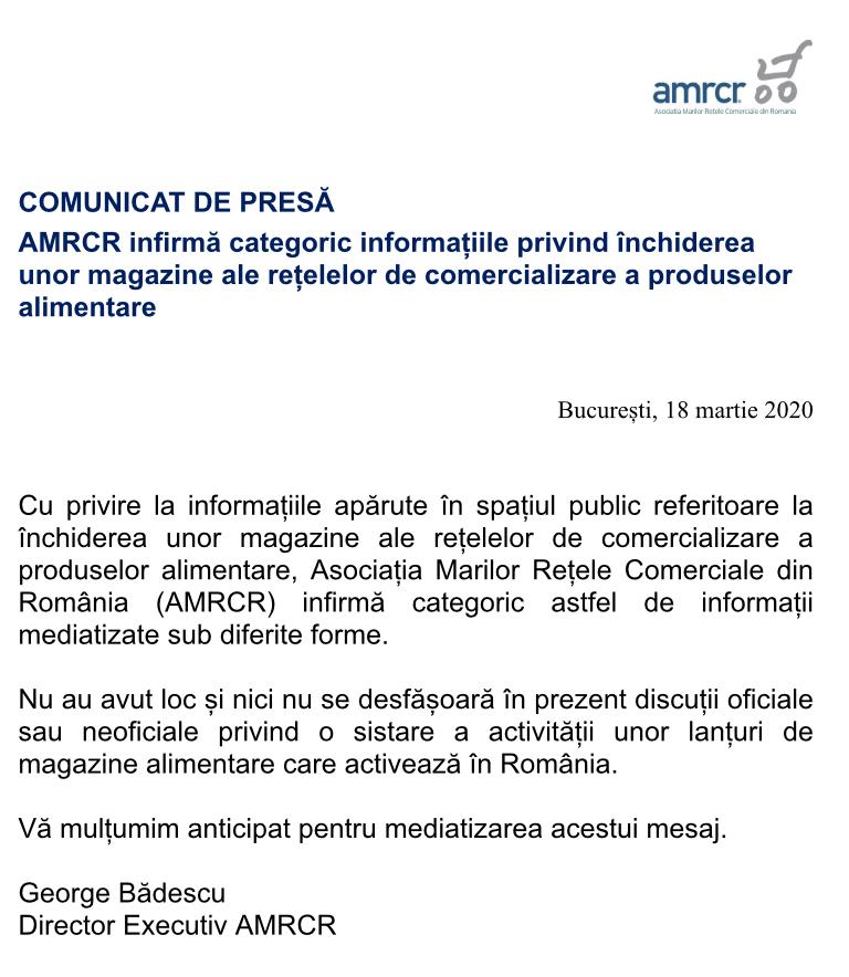 🔴Având în vedere știrile false transmise în spațiul public privind închiderea unor supermarketuri, atașăm comunicatul Asociației Marilor Rețele Comerciale din România prin care sunt infirmate aceste zvonuri, afirmându-se ferm că niciun mare comerciant NU are intenția să închidă magazinele.