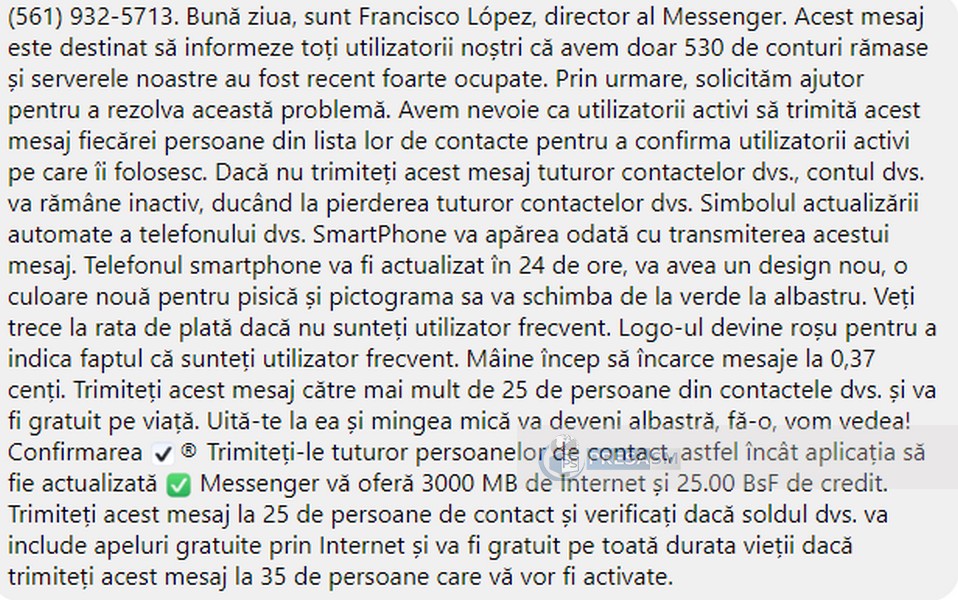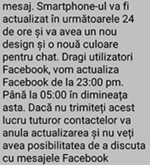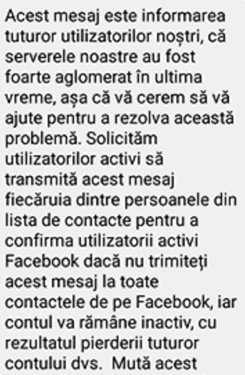 “Desigur, odată cu problemele tehnice au apărut și hoax-urile, așa cum se poate observa în mesajul din imagini. Utilizatorii primesc un mesaj într-o limbă română incorectă, prin care sunt alertați că își vor pierde accesul la conturi, după revenirea serviciilor online, în cazul în care nu distribuie acel mesaj la toată lista de contacte,” avertizează cei de la Cert-ro.Un “hoax” este o încercare de a înşela, de a face publicul să creadă o anumită informație. Păcăleala poate avea deseori un obiect material, însă nu în toate cazurile, mai spun specialiștii în securitate cibernetică.