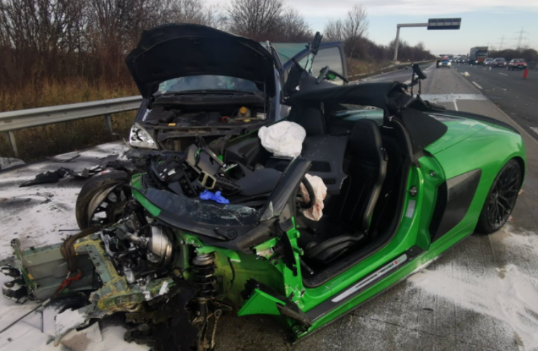 Potrivit sursei citate, impactul a fost atât de violent încât bucăți din autoturismul Audi R8 Spyder au ajuns la peste 400 de metri distanță de locul accidentului. Mașina a fost complet distrusă, iar șoferul a rămas încarcerat. Pompierii l-au scos în stare gravă dintre fiarele contorsionate și l-au transportat la spital.