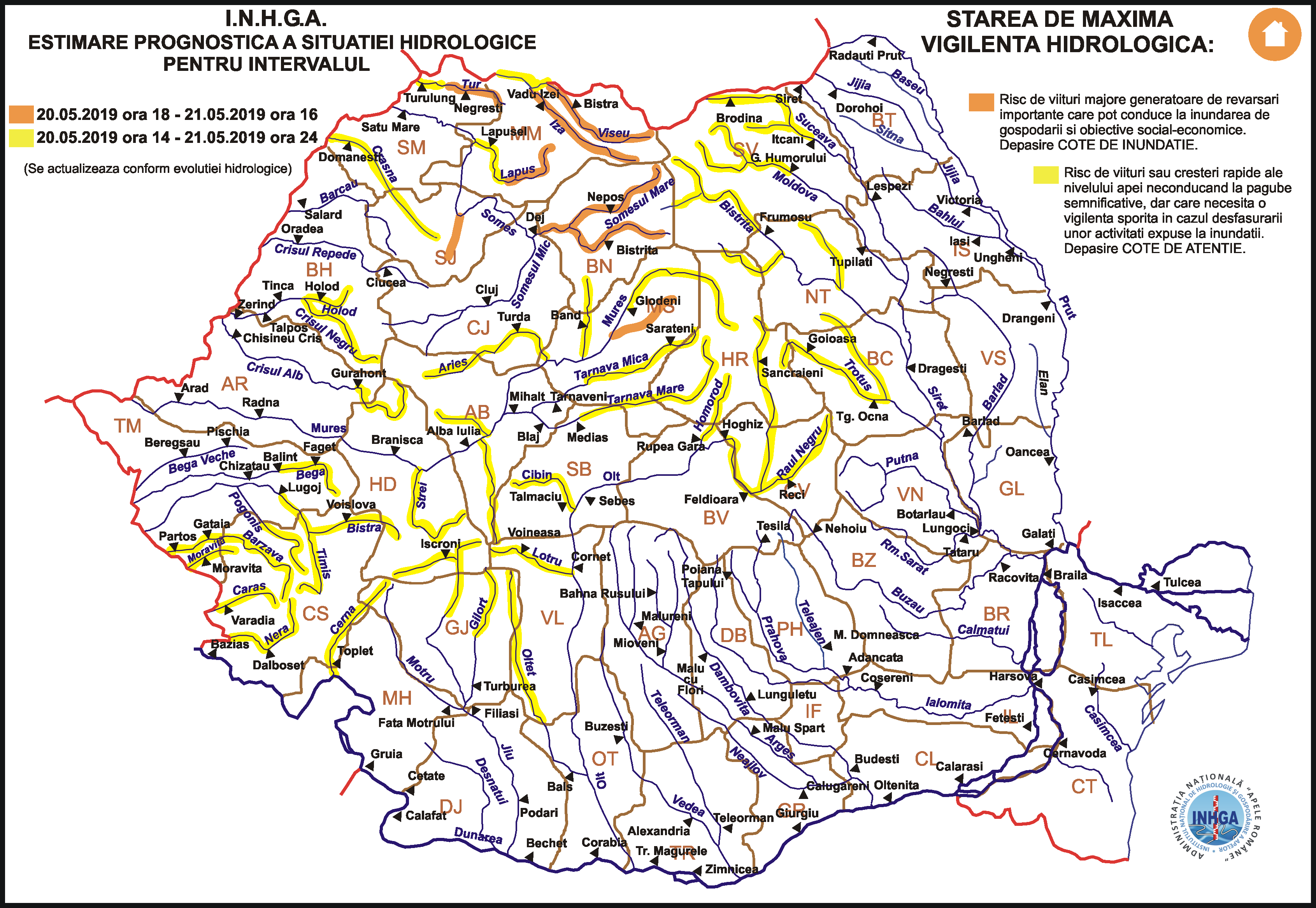"Cod portocaliu în intervalul 20.05.2019 ora 18:00 – 21.05.2019 ora 16:00pe râurile din bazinele hidrografice: Vişeu, Iza (judeţul Maramureş), Tur – bazin superior (judeţul Satu Mare), Someşul Mare - (judeţul Bistriţa Năsăud), Someş – afluenţii mici aferenţi sectorului aval S.H. Dej – amonte S. H. Satu Mare (judeţele Cluj, Sălaj, Maramureş şi Satu Mare), Lăpuş - bazin superior şi afluenţi bazin mijlociu şi inferior (judeţul Maramureş), Niraj (judeţul Mureş)," se arată în avertizarea transmisă de hidrologi.