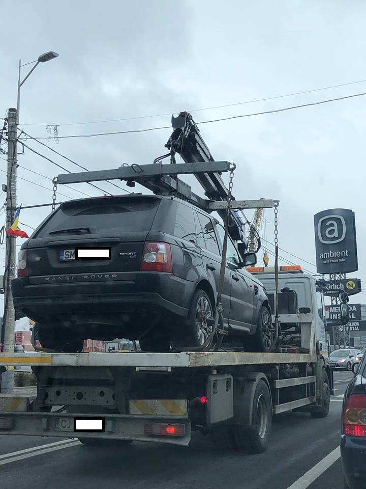 Un autoturism de teren marca Range Rover Sport, înmatriculat în județul Satu Mare, a fost ridicat de un echipaj special al Primăriei Cluj-Napoca. Se pare că șoferul a staționat cu bolidul într-un loc nepermis. Totul s-a întâmplat astăzi, în jurul orei 10.30.
