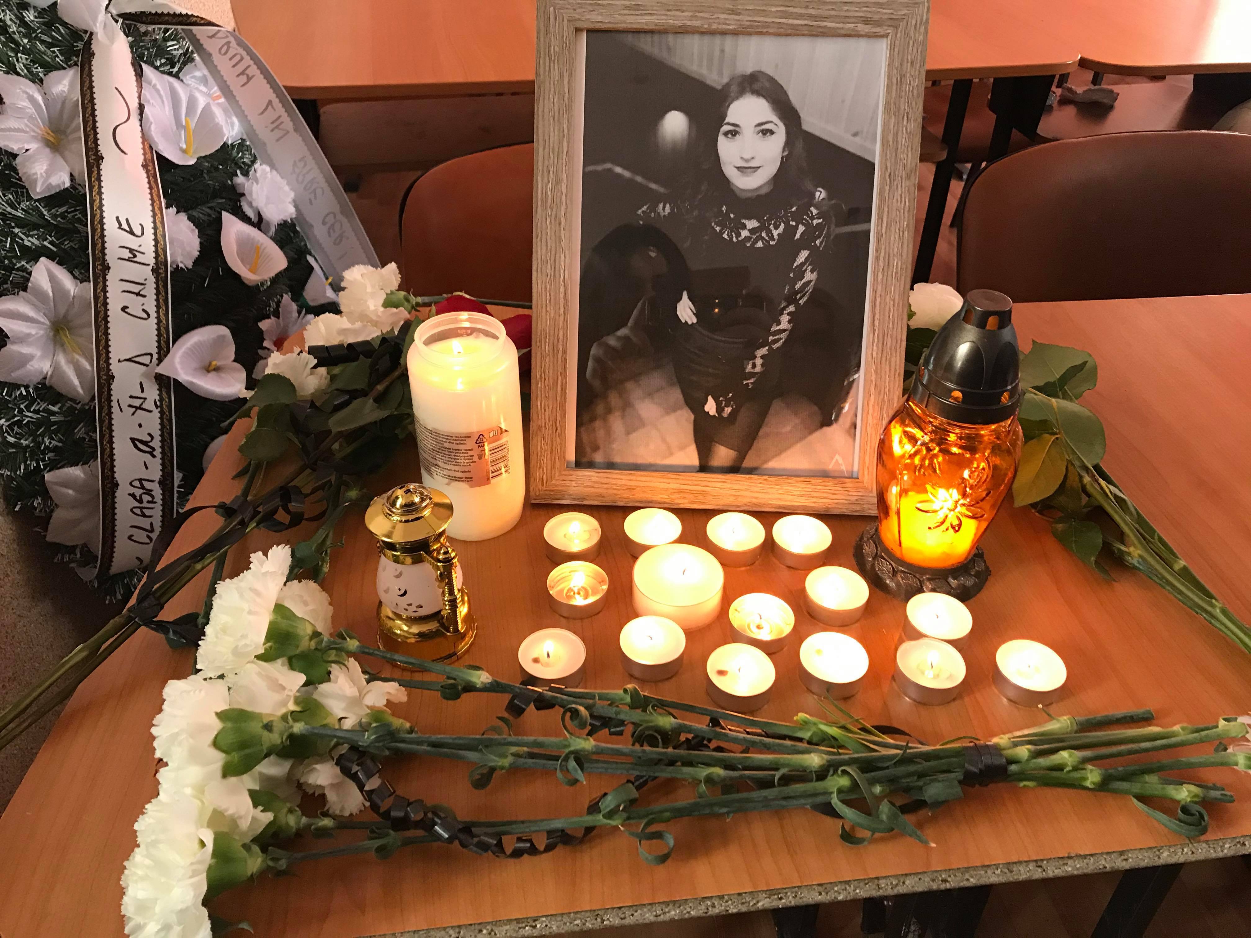 În curtea școlii, pe o bancă a fost plasat portretul tinerei Carmen, iar colegii și cadrele didactice au aprins lumânări și au depus flori în semn de omagiu.