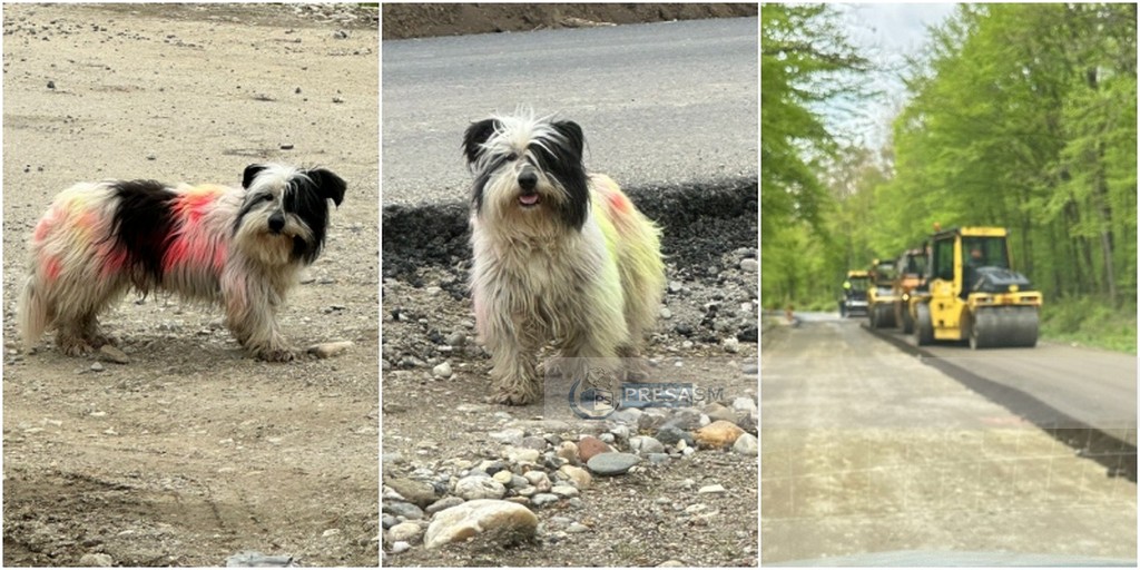 Unii muncitori care efectuează lucrări de modernizare pe Drumul Județean 108R, care face legătura între localitățile Beltiug-Dobra-Hurezu-Bogdand-Hodod, până la limita cu județul Sălaj, au considerat de cuviință să batjocorească un biet cățel, vopsindu-l cu spray de diferite culori.