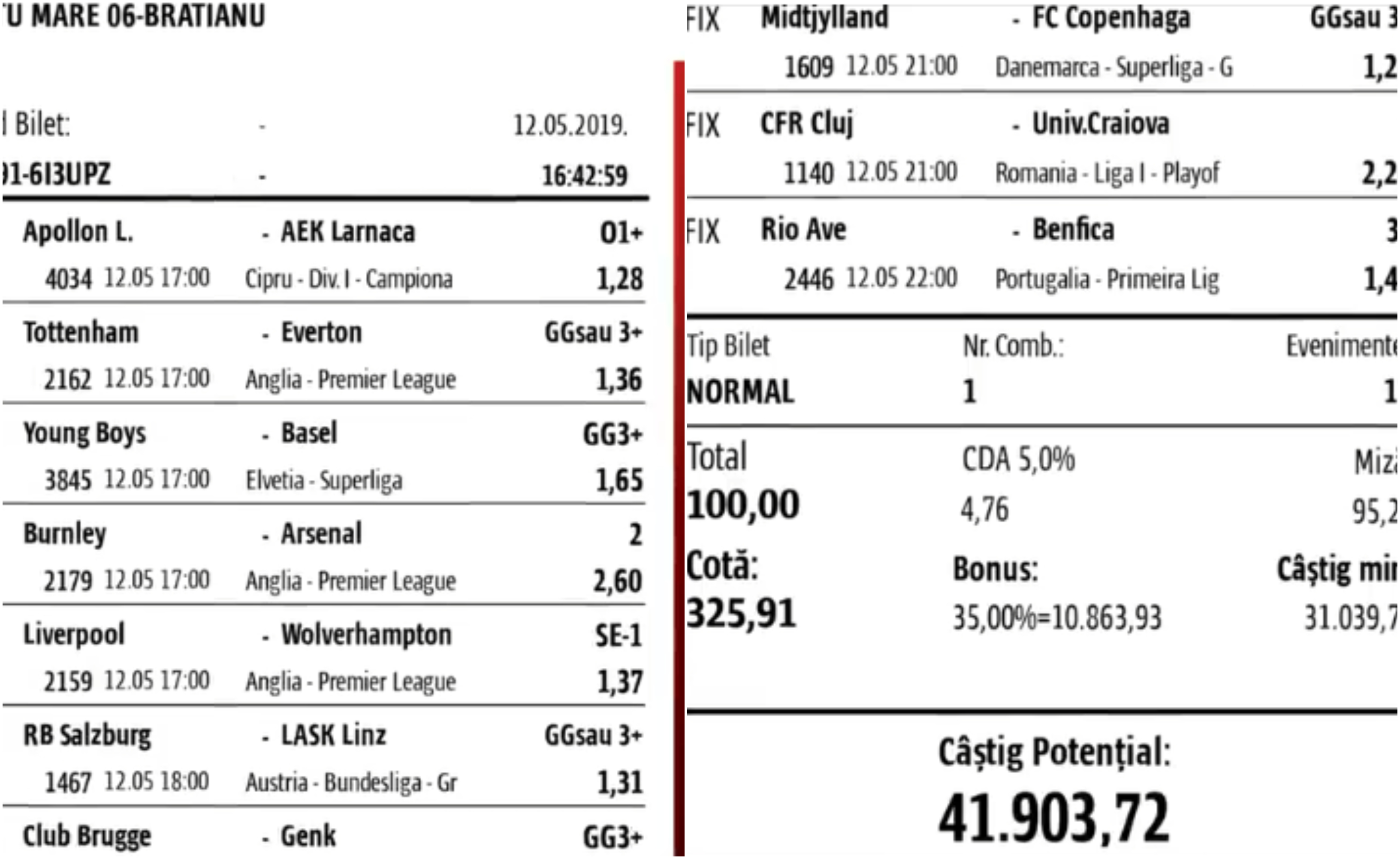 ”Biletul câștigător al zilei vine din Satu Mare și are 13 evenimente, toate din fotbal, preponderent de tip „Solist” și „GG”. Norocosul parior a mizat 100 de lei pe o cotă totală de 325 și a obținut un câștig de peste 41.000 de lei”, spun cei de la agenția de pariuri sportive.