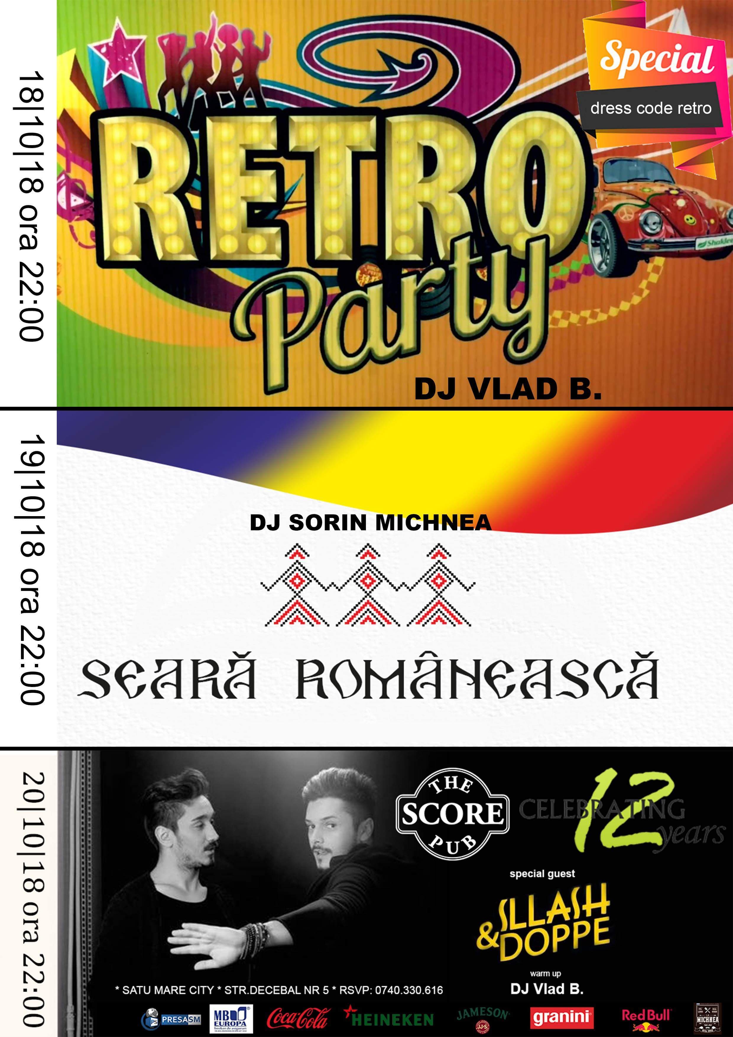 Anul acesta, Score Pub promite trei zile de distracție tematice începând cu data de 18 octombrie. Joi avem retro party cu tematica de Dress Code: îmbrăcăminte retro, iar cei de la Score Pub oferă un premiu pentru cea mai tare gască retro cu DJ Vlad B.. Vineri, 19 octombrie, avem seară românească cu cele mai tari hituri autohtone, atât vechi cât și noi, cu Dj Sorin Michnea.