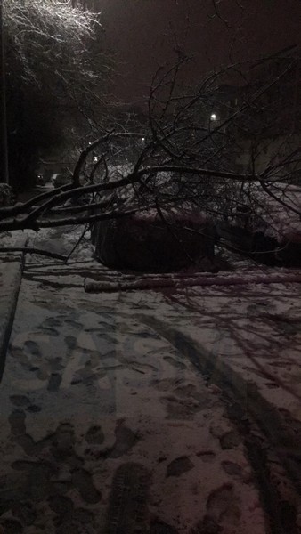 Din cauza zăpezii depuse pe un copac, acesta a cedat de la baza tulpinii și s-a prăbușit peste două autoturisme.