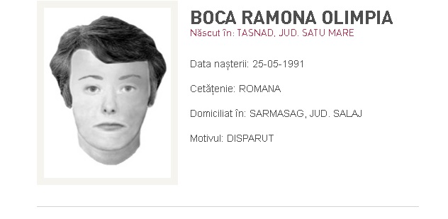 2. Boca Ramona Olimpia, născută în data de 25.05.1991, din localitatea Tășnad, în cursul lunii octombrie 2001, a dispărut de pe raza comunei Căuaș.
