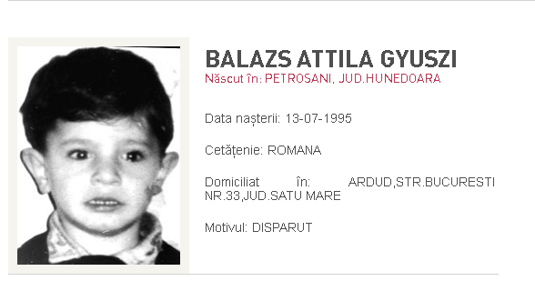 - Balazs Attila Gyuszi, născut în data de 13.07.1995, din localitatea Ardud, dispărut de la domiciliu la data de 20.08.1998. Polițiștii iau în calcul ca minorul să fi fost vândut unor rețele de cerșetorie.
