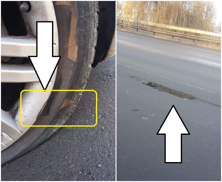 Lucrările recent executate pe Podul Decebal de către o firmă din Zalău au cedat și au apărut deja ditamai gropile! Un șofer din municipiul Satu Mare a avut neșansa să ia în plin o astfel de groapă și și-a tăita roata de la mașină.
