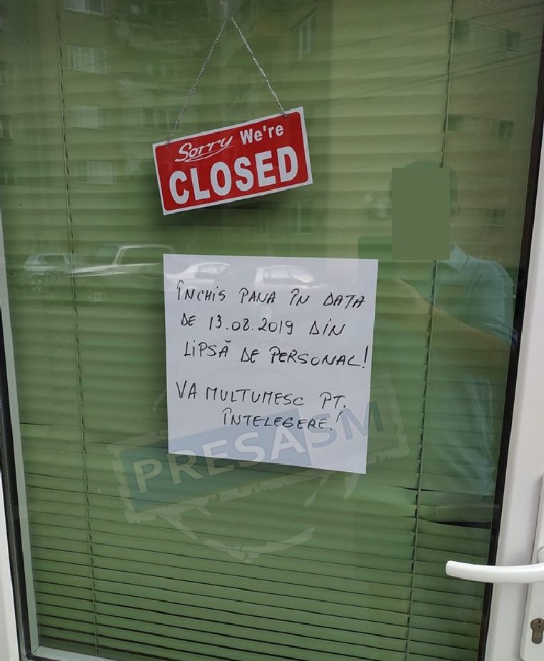 ”Închis până în data de 13.08.2019 din lipsă de personal. Vă mulțumim pentru înțelegere”, este mesajul proprietarului de magazin.