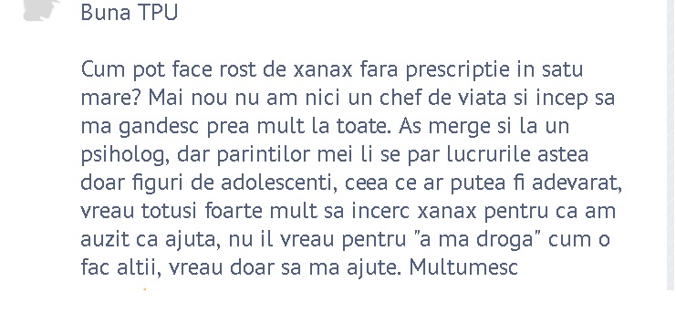 ”Cum pot face rost de xanax fara prescriptie in satu mare? Mai nou nu am nici un chef de viata si incep sa ma gandesc prea mult la toate. As merge si la un psiholog, dar parintilor mei li se par lucrurile astea doar figuri de adolescenti, ceea ce ar putea fi adevarat, vreau totusi foarte mult sa incerc xanax pentru ca am auzit ca ajuta, nu il vreau pentru "a ma droga" cum o fac altii, vreau doar sa ma ajute”, este mesajul lui Darude.