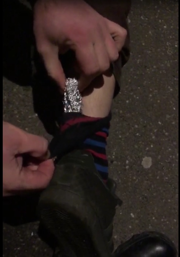 Cu ocazia controlului corporal, jandarmii au găsit asupra tânărului, ascuns în ciorapul de la piciorul drept, un pliculeț din staniol, în care se afla o substanță solidă cu miros înțepător, de culoare verde - olive.