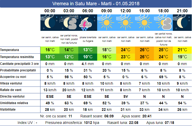 Vremea va fi foarte bună de 1 mai. Cu toate că în următoarele zile valorile de temperatură vor scădea în județul Satu Mare. Vineri, 27 aprilie, temperaturile se vor situa între 9 și 18 grade Celsius, fără risc de precipitații, în timp ce norii vor acoperi răzleț cerul.