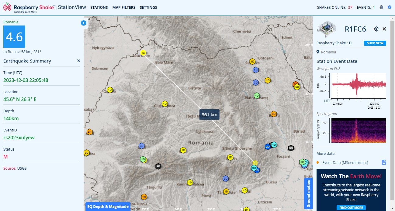 Două cutremure au fost înregistrate de seismometrul Raspberry Shake de la Colegiul Național Mihai Eminescu din municipiul Satu Mare în data de 4 decembrie 2023. Este vorba despre cutremurul de adâncime produs în zona Vrancea la ora 00:05:48, la adâncimea de 132.5 km, având magnitudinea 4.8 grade pe scara Richter. Al doilea cutremur, de această dată de suprafață, s-a produs în vestul Turciei, la sud de Istanbul, la ora 09:42:40, la o adâncime de 5.9 km, având magnitudinea 5.4 grade pe scara Richter.