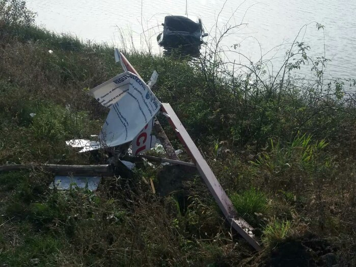 Șoferița a pierdut controlul volanului, a ieșit de pe partea carosabilă și s-a trezit direct în lac. Mai exact, nu a adaptat viteza la un drum în pantă, s-a lovit de un panou publicitar și a ajuns în apă.