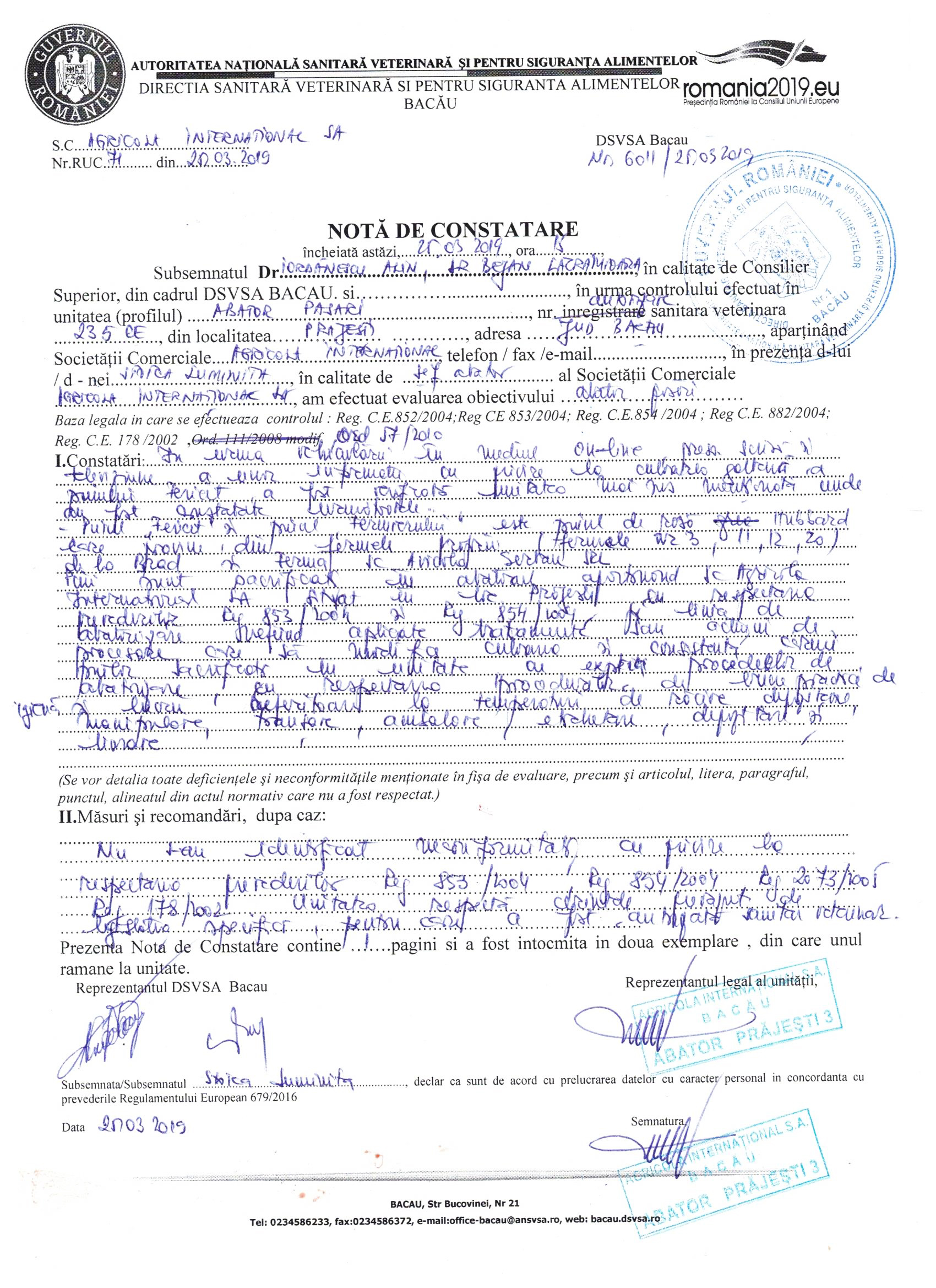 Nota de constatare nr. 6011/ 25.03.2019 - ANSVSA – Direcția Sanitară Veterinară și pentru Siguranța Alimentelor Bacău.