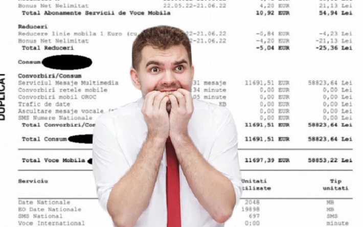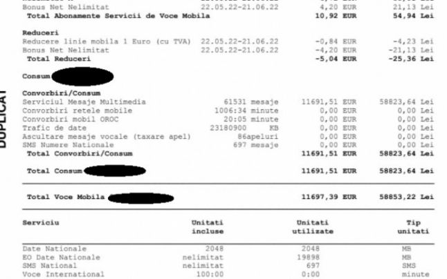 Conform facturii, au fost 61.531 de mesaje de pe acel număr de telefon 1.006 ore şi 34 de minute de convorbiri şi s-a făcut trafic de date de 23.180.900 KB. Astfel, factura totală a ajuns la 70.111,19 lei. Bărbatul spune că numărul ar fi trebuit blocat în momentul în care factura a depăşit 100 de euro, deoarece abonamentul era limitat.