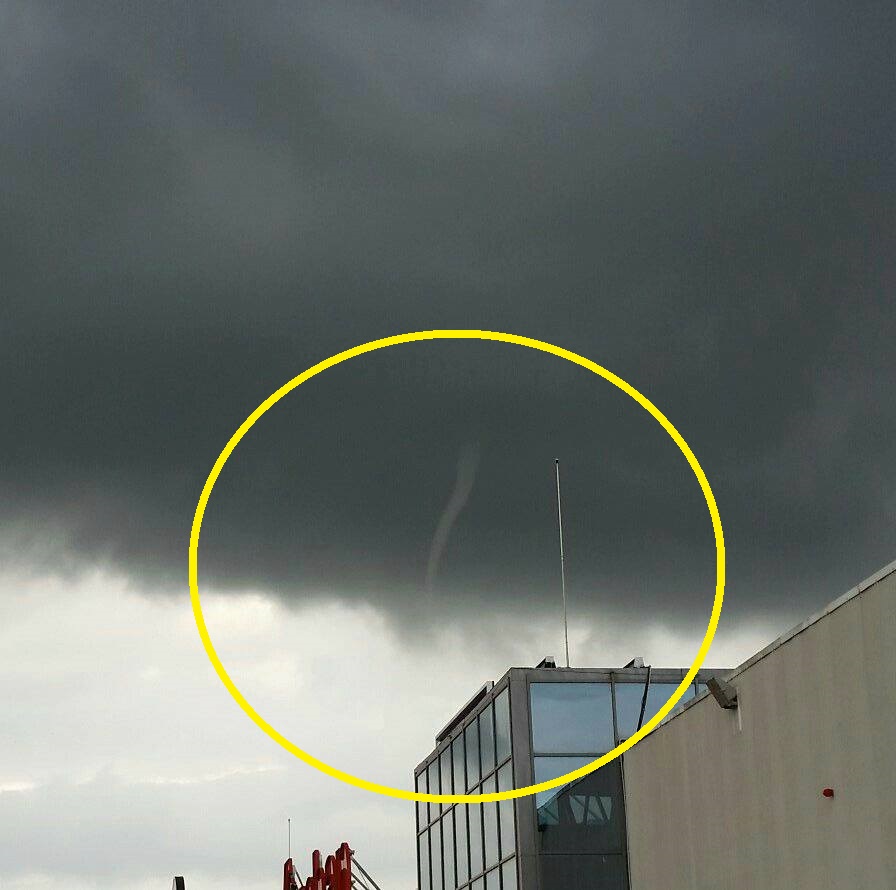 Vârtej deasupra municipiul Satu Mare. Pâlnia s-a format sub o formațiune noroasă, în zona Drumului Careiului, fiind surprinsă din parcarea supermarketului Auchan.