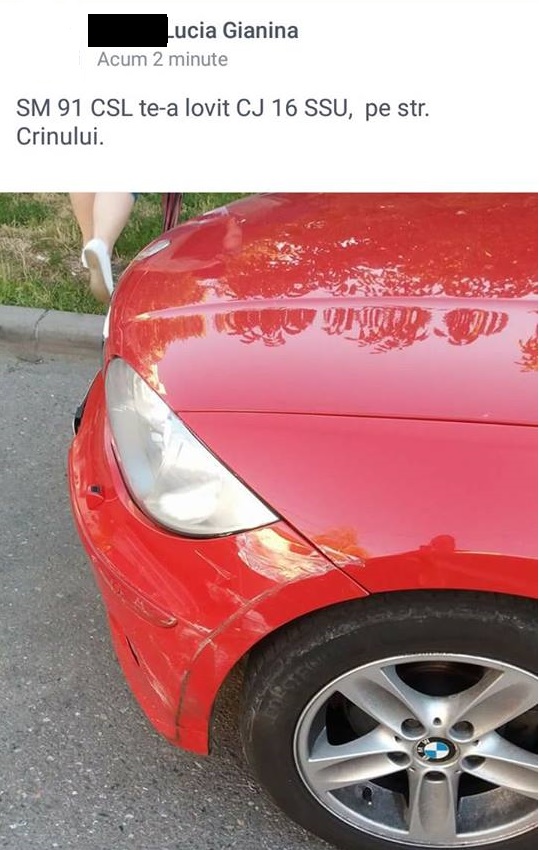 P. Lucia Gianina a văzut întreaga scenă, a făcut o poză cu mașina avariată și a postat un mesaj pe Facebook cu numărul șoferul vinovat. ”SM 91 CSL te-a lovit CJ 16 SSU pe strada Crinului”.