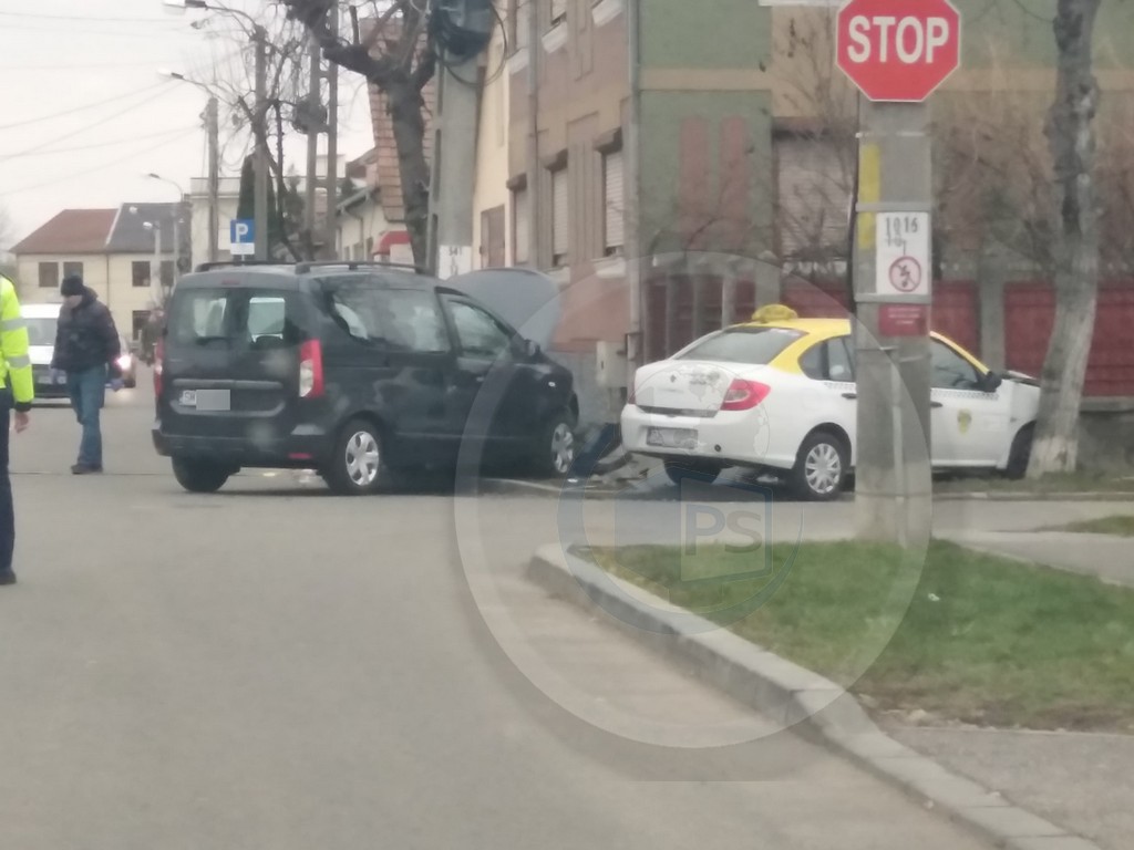 FOTO. Impact între un taxi și un autoturism. S-au oprit în stâlp și în gard, în Satu Mare