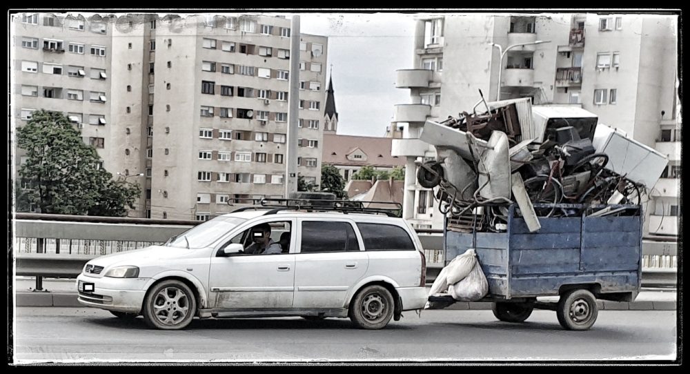 Căutătorii de fier vechi din județul Sălaj continuă să se dea în spectacol prin județul Satu Mare. O astfel de imagine a fost surprinsă vineri pe Podul Decebal, acolo unde un tânăr conducea o mașină, care tracta o remorcă în care era imposibil să mai pui ceva.