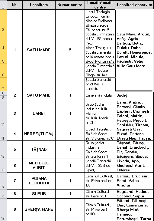 1. Cinci centre au fost amenajate în municipiul Satu Mare (1. Liceul Teologic Ortodox Român Nicolae Steinhardt, str. George Călinescu nr.51; 2. Școala Gimnazială cu clasele I-VIII ”Bălcescu Petofi”, Aleea Trotușului nr. 2; 3. Școala Gimnazială cu clasele I-VIII ”Avram Iancu”, B-dul Muncii nr.19; 4. Școala Gimnaziala cu clasele I-VIII ”Lucian Blaga”, str. Ion Vidu nr.51-53 și 5. Școala Gimnazială cu clasele I-VIII ”Vasile Lucaciu” str. Rodnei nr.64)