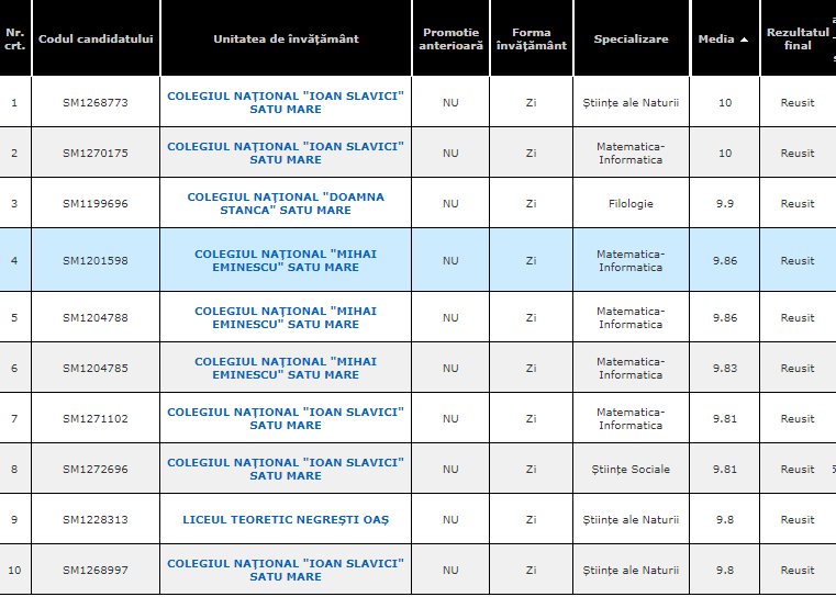În TOPUL celor mai bune zece medii din județul Satu Mare, Colegiul Național ”Ioan Slavici” are nu mai puțin de cinci elevi. Pe locul secund se află Colegiul Național ”Mihai Eminescu” cu trei elevi, urmat de Colegiul Național ”Doamna Stanca” cu un elev, respectiv Liceul Teoretic Negrești-Oaș cu un elev.