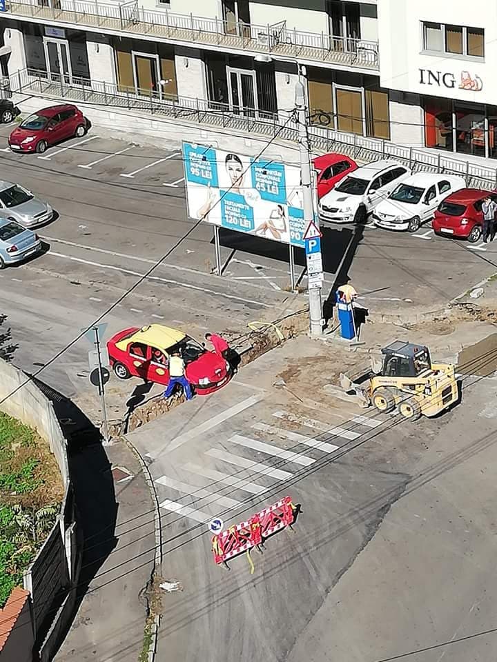 Ghinion curat pentru un taximetrist din municipiul Satu Mare. Acesta nu a observat un șanț săpat de muncitorii unei firme de construcții (care se pare că nu ar fi fost semnalizat tocmai corespunzător) și a ajuns blocat cu roțile din față.