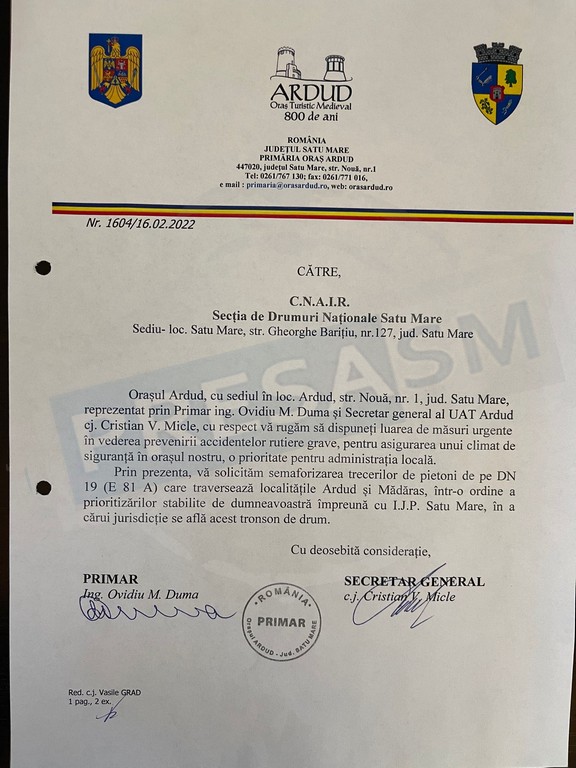 Primarul orașului Ardud, Ovidiu Duma, a precizat pentru PresaSM că a solicitat Companiei Naționale de Administrare a Infrastructurii Rutiere să semaforizeze o parte dintre trecerile de pietoni care străbat drumul național, în zona centrală.