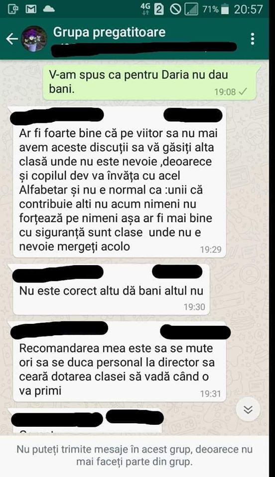 "Nu am facut-o, pentru că este ilegal( art. 5, lit. b), pct. II din Codul Cadru de etica al personalului didactic aprobat prin Ordinul MEN nr. 4831/2018) și imoral. Nu am facut-o, pentru că de ani de zile încercăm să schimbam țara asta, pentru că ne plângem de indiferența și șpăgile care domnesc în toate instituțiile statului, dar noi, ca actori principali, nu facem nimic sau chiar contrariul. Să ajung să fiu "sfătuită" să-mi mut copilul în altă clasă, e prea mult. Pentru mine și pentru copilul meu", a explicat femeia, uimită de faptul că ceilalți părinți chiar i-au cerut să își mute copilul din clasă.