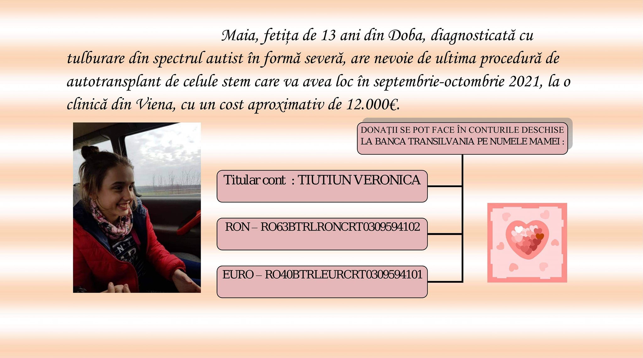 Donațiile se pot face în conturile deschise pe numele mamei: TIUTIUN VERONICA