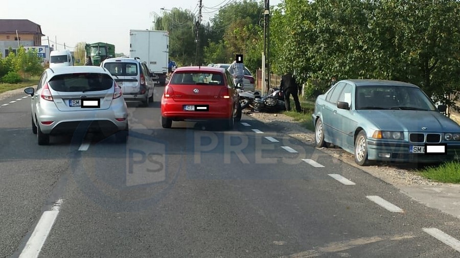 Accident pe Bulevardul Lucian Blaga, din municipiul Satu Mare. Totul s-a întâmplat astăzi, în jurul orei 08.50. Potrivit primelor informații, un bărbat, aflat pe o motocicletă, a intrat într-un autoturism înmatriculat în județul Cluj, care ar fi staționat, având în fața sa o altă mașină.