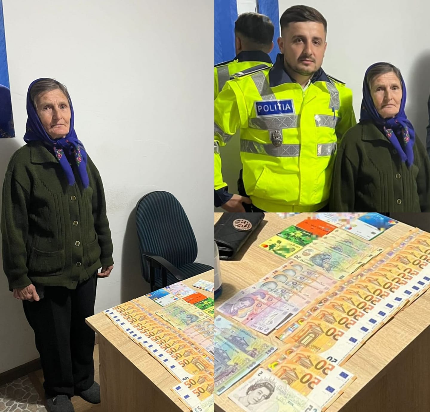 În prezenta bătrânei, polițiștii au verificat portofelul găsit, stabilind că în interior se aflau de 850 Euro, 400 de lei și 5 Lire precum și documente de identitate și carduri bancare.