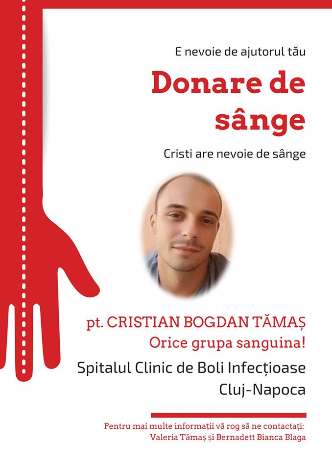 Redăm mai jos apelul sătmărencei:”Pentru că starea de sănătate a fratelui meu s-a agravat, vă rog pe cei care pot și vor, să-l ajute prin a dona sânge! Se poate dona la orice Centru de Transfuzie Sanguină și nu este relevantă grupa sanguină. V-aș ruga să menționați numele lui: Cristian Bogdan Tămaș. Să se trimită, Spitalul Clinic de Boli Infecțioase Cluj-Napoca. Vă rog să distribuiți în număr cât mai mare ca să ajungă la cât mai mulți! În cazul în care aveți nevoie de mai multe informații, vă rog să ne contactați! Valeria Tamas și Bernadett Bianca Blaga! Vă rog ca după donare să faceți o poză adeverinței de la Centru de Transfuzie Sanguină și să ne-o trimiteți pe messenger. Avem nevoie de aceea dovadă pentru a o da Spitalului de Boli Infecțioase Cluj-Napoca! Altfel nu vom știi câți au donat!”